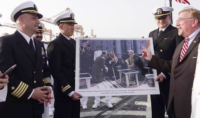 Sunday marked the 75th anniversary of the meeting between President Franklin D. Roosevelt and King Abdul Aziz on board the USS Quincy in 1945, the US Ambassador to Saudi Arabia John Abizaid made an visit to Jeddah and reenacted the famous meeting on board the USS Farragut in honor of the occasion.
